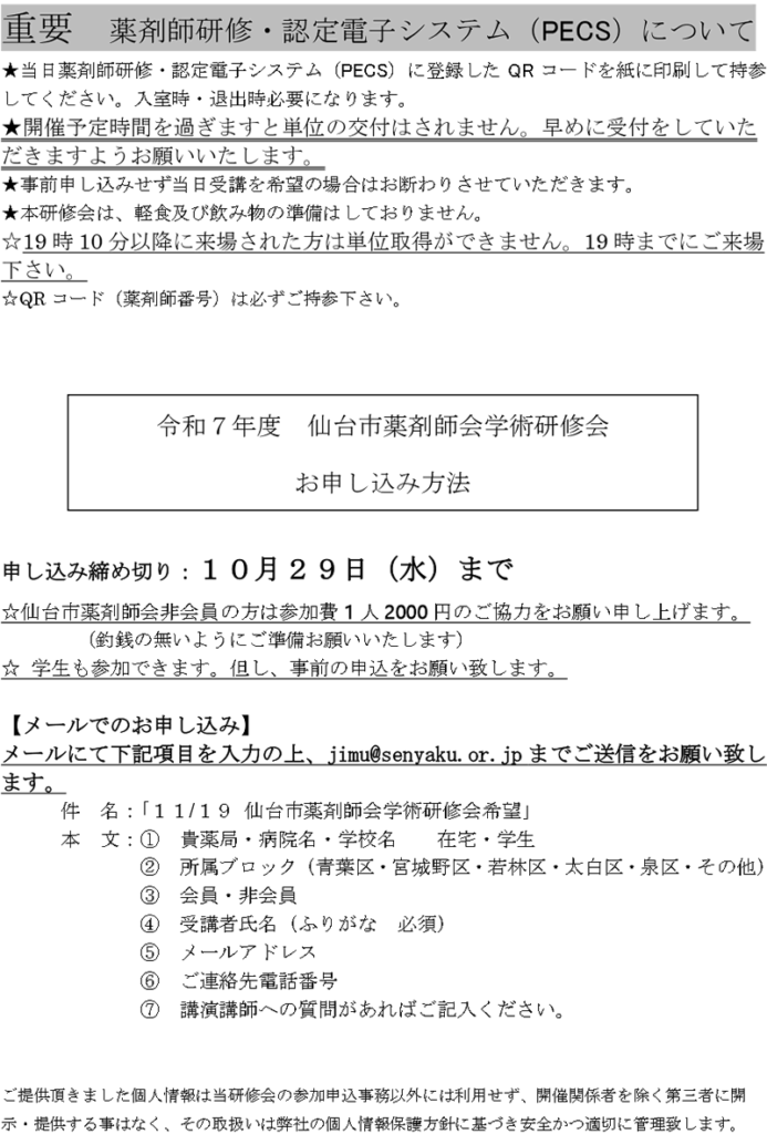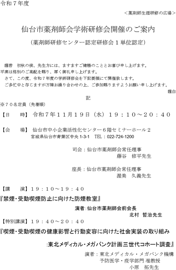 令和7年度受動喫煙防止WG研修会 案内 申込書ダウンロード 【メールでのお申し込み】メールにて下記項目を入力の上、jimu@senyaku.or.jpまでご送信をお願い致します。件 名:「11/19 仙台市薬剤師会学術研修会希望」本 文:①貴薬局・病院名・学校名 在宅・学生 ②所属ブロック(青葉区・宮城野区・若林区・太白区・泉区・その他) ③会員・非会員④受講者氏名(ふりがな 必須)⑤メールアドレス⑥ご連絡先電話番号⑦講演講師への質問があればご記入ください。 申込書ダウンロード