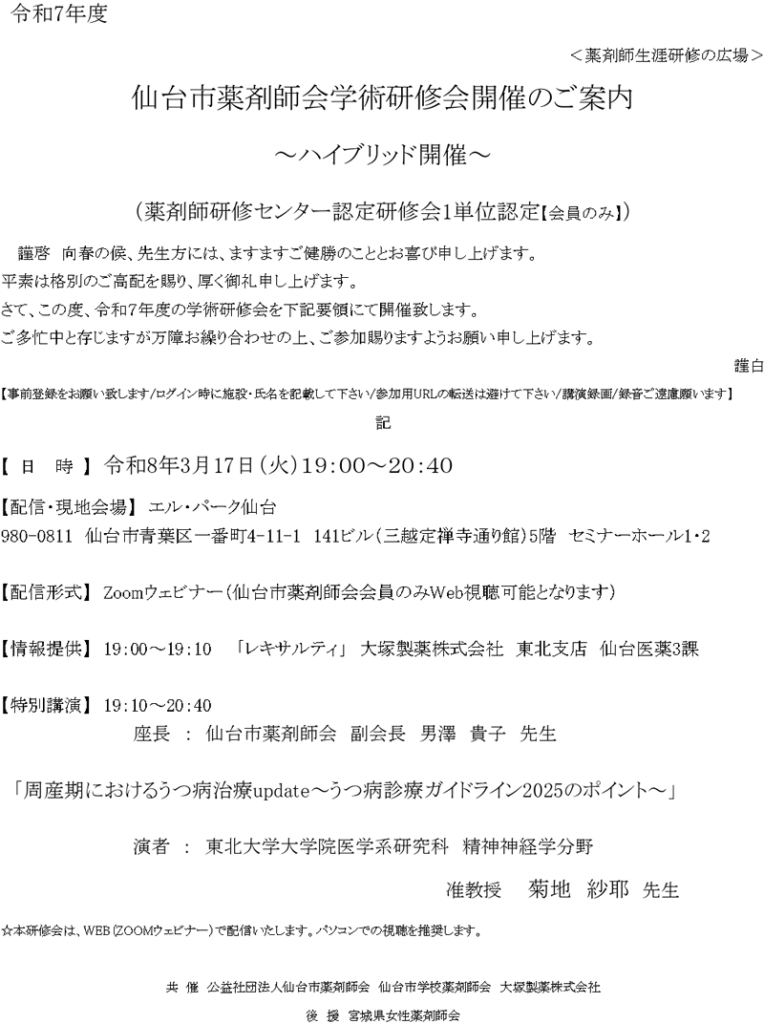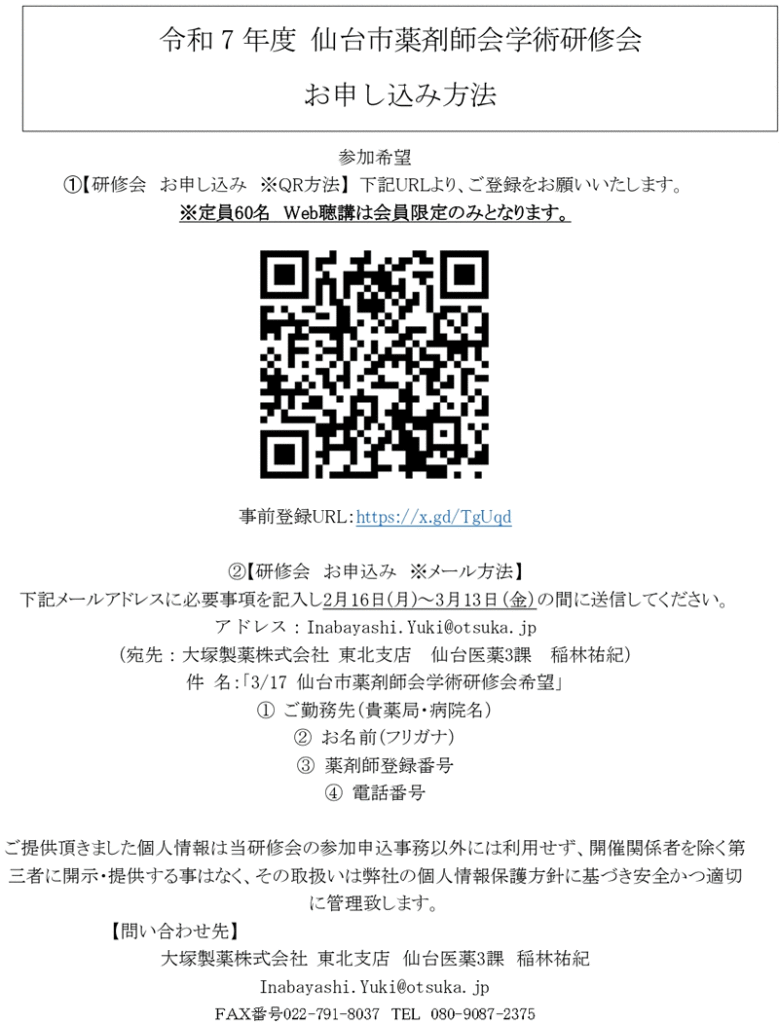 周産期におけるうつ病治療update~うつ病診療ガイドライン2025のポイント~ 申込書ダウンロード 事前登録URL:https://x.gd/TgUqd ②【研修会 お申込み ※メール方法】 下記メールアドレスに必要事項を記入し2月16日(月)~3月13日(金)の間に送信してください。アドレス:Inabayashi.Yuki@otsuka.jp (宛先:大塚製薬株式会社 東北支店 仙台医薬3課 稲林祐紀) 件 名:「3/17 仙台市薬剤師会学術研修会希望」 ① ご勤務先(貴薬局・病院名) ② お名前(フリガナ) ③ 薬剤師登録番号 ④ 電話番号 申込書ダウンロード