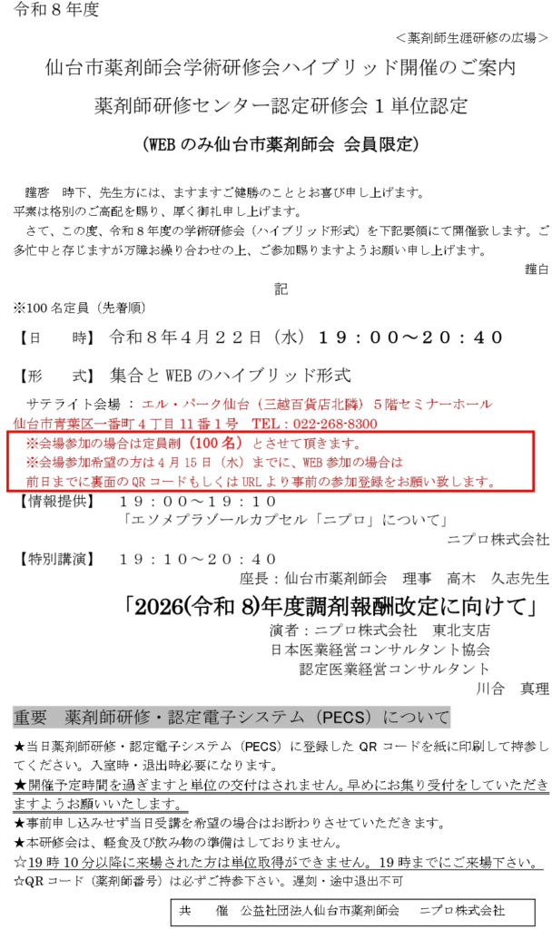 2026(令和8)年度調剤報酬改定に向けて 仙台市薬剤師会学術研修会ハイブリッド開催のご案内
