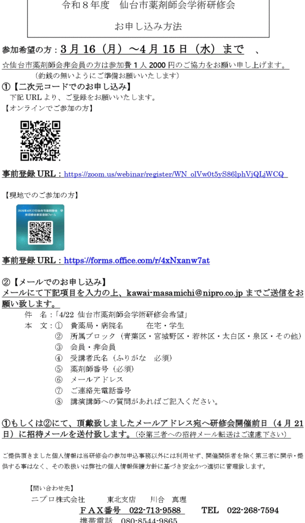 件 名:「4/22 仙台市薬剤師会学術研修会希望」